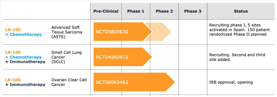 - LB-100 임상 시험: 첫 번째 환자 대상 임상시험에서 대장암 및 직장암 치료제로서 LB-100 투여를 개시했습니다.