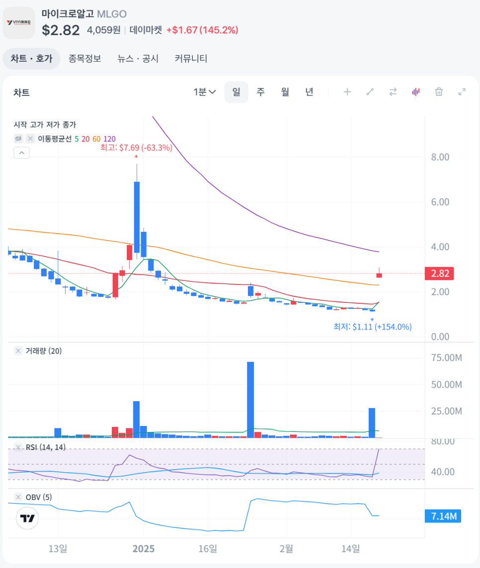 마이크로알고의 주가는 최근 한 달 동안 무려 635%나 급등했어요! 하지만 이런 급격한 상승이 지속될지는 불확실하다는 의견이 많습니다. 현재 주가는 변동성이 크지만, AI와 빅데이터 시장의 성장세를 고려할 때 장기적으로는 가능성이 있다고 해요. 보수적으로 보면 향후 1년간 -20%에서 +20% 정도의 가격 변동이 있을 것으로 예상됩니다.